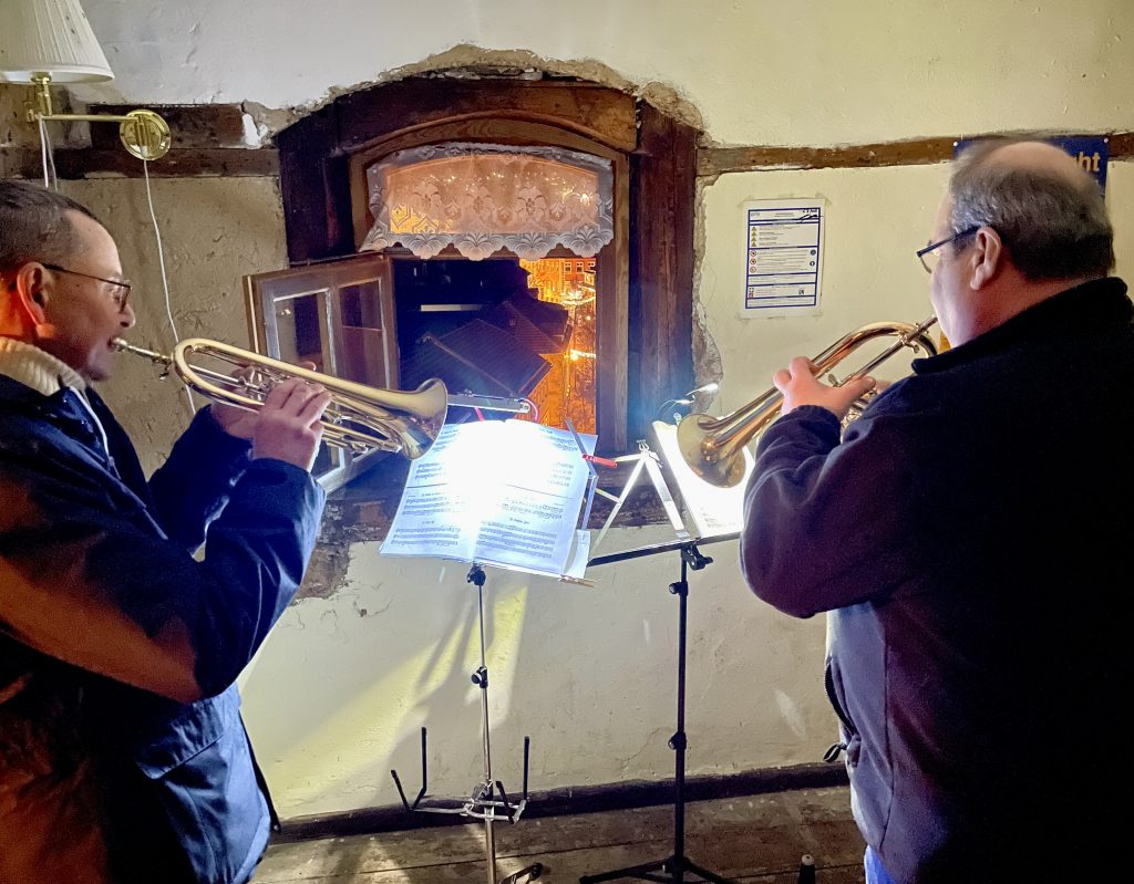 Den Zuhörern wurden verschiedene kirchliche und weltliche Stücke passend zur Adventszeit auf der höchstgelegenen Ilmenauer Stadtbühne geboten. Vier Instrumentalgruppen begaben sich auf den Weg über den nördlichen Turmaufgang und bezwangen 114 Stufen bis hinauf zur ehemaligen Türmerstube. Die Gäste erfreuten sich am Spiel von Trompeten, Saxophonen, Jagdhörnern und Posaunen.